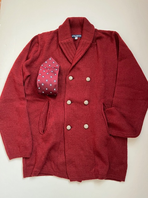 ボルドーニットジャケットをラフに羽織って