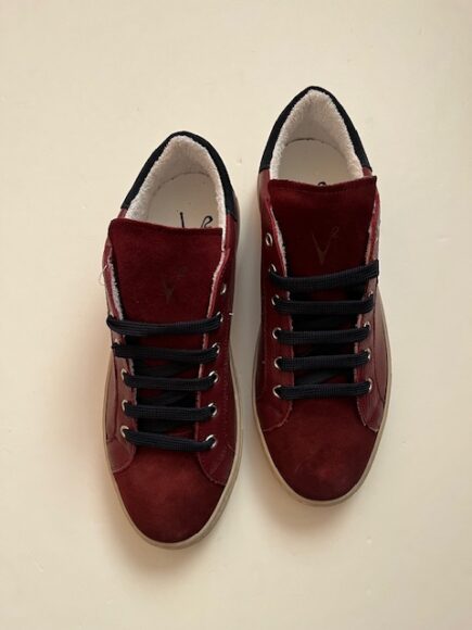 スムースレザーとスエードのコンビがボルドーカラーで