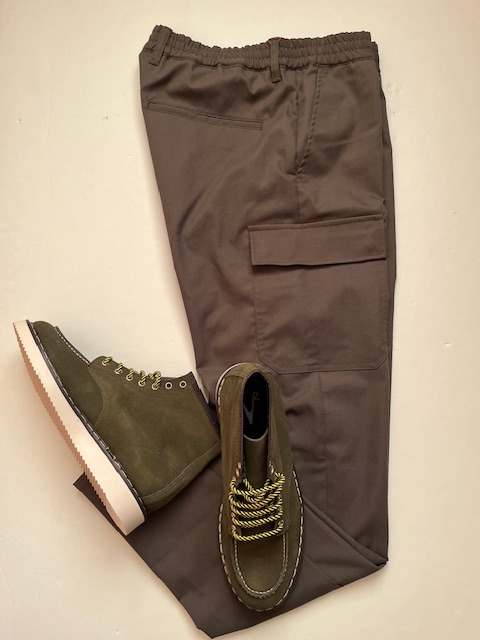 秋のカーゴパンツとブーツの緑色で鮮度アップ