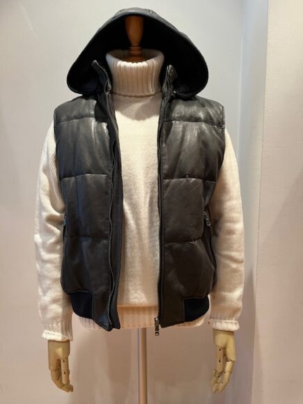 ニットの上、ジャケットにも余裕でレザーのリッチさと、フードのスポーティな