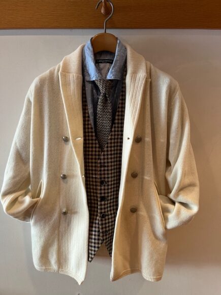 ニットジャケットにカジュアルなシャツタイにジレのドッレシーさを、