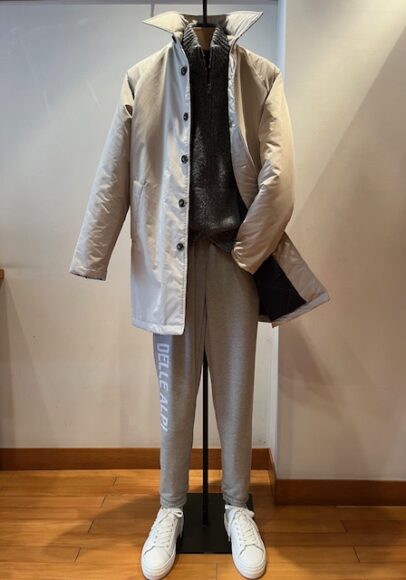 ニットジャケットをインナーに着てダウンコートにスェットパンツで