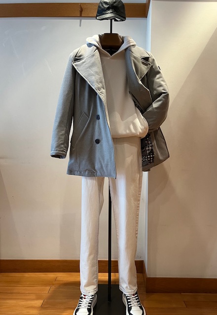 ピーコートの中に着込んだパーカ、白パンで上下とも味わい深い装いに。