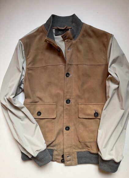 袖や裙にリブをあしらい前身頃に色合いが美しいヌバック素材を使用。