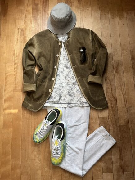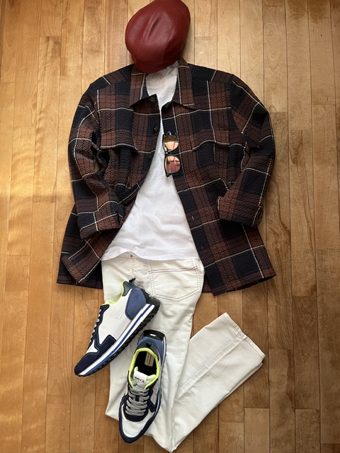 ベージュのシャツジャケットを白とグレーで統一